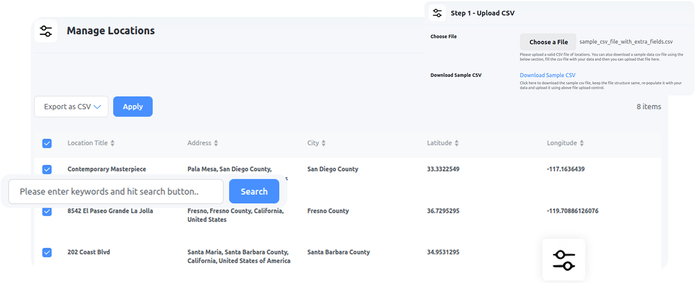 Show locations in responsive list/grid views with search, filters, and sorting options.
